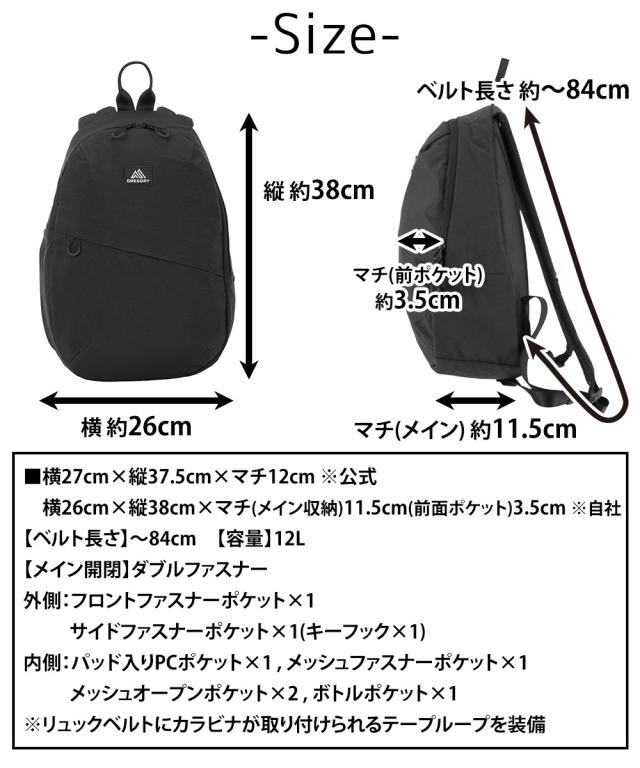 | サイズ(約) ※当店実寸値 | 公式サイズ 横27cm×縦37.5cm×マチ12cm 自社採寸サイズ 横26cm×縦38cm×マチ(メイン収納)11.5cm(前面ポケット)3.5cm 【リュックベルト長さ】〜84cm 【容量】12L | ||