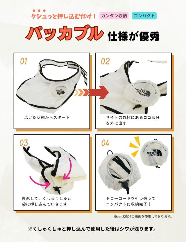 安全性の高いファスナー開閉式で、サイドの丸枠を利用してコンパクトに収納出来るパッカブル仕様になっています。