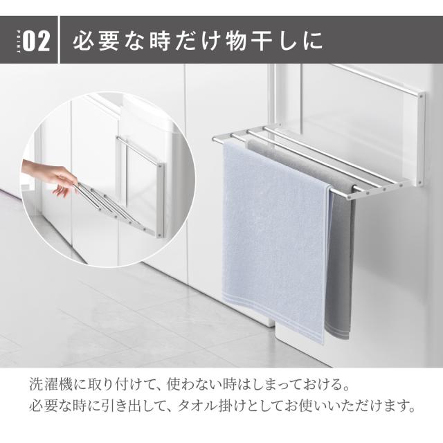 【必要な時だけ物干しに】洗濯機に取り付けて、使わない時はしまっておける。必要な時に引き出して、タオル掛けとしてお使いいただけます。