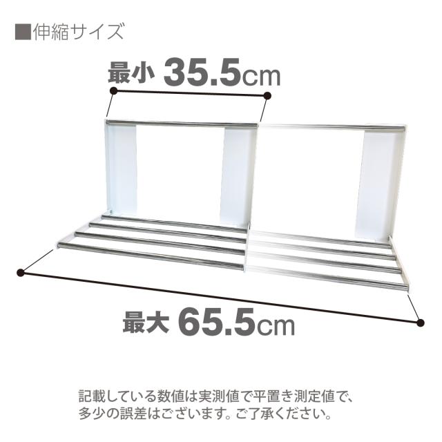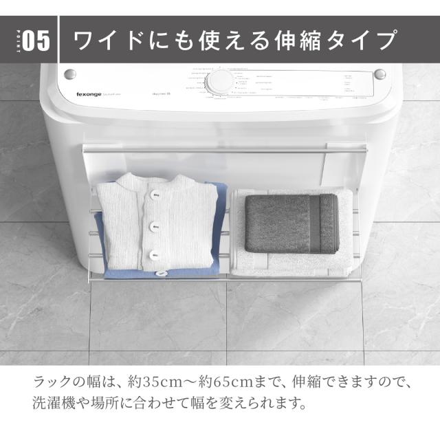 【ワイドにも使える伸縮タイプ】ラックの幅は、約35cm〜約65cmまで、伸縮できますので、洗濯機や場所に合わせて幅を変えられます。