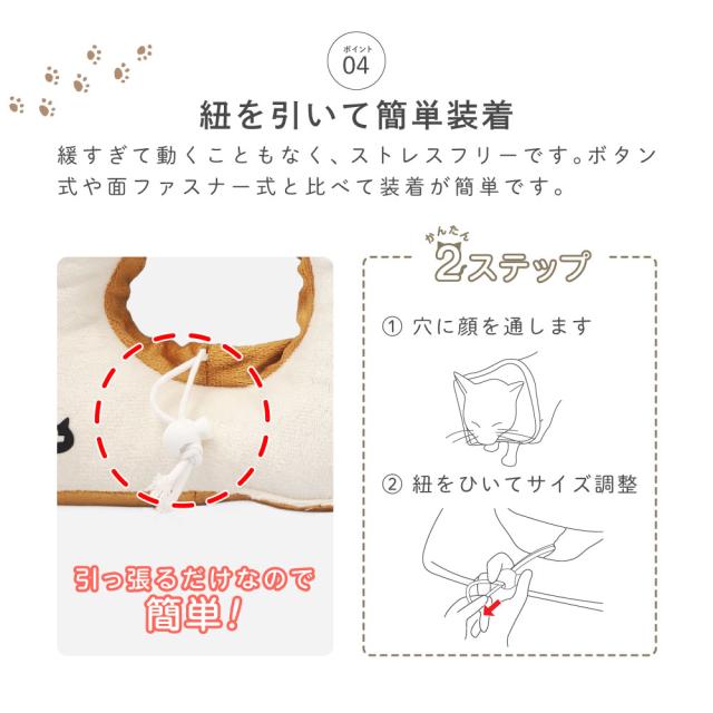 穴から顔を通し、首のサイズに合わせて紐を引っ張って調整するだけ。緩すぎて動くこともなく、ストレスフリーです。ボタン式や面ファスナー式と比べて装着が簡単です。