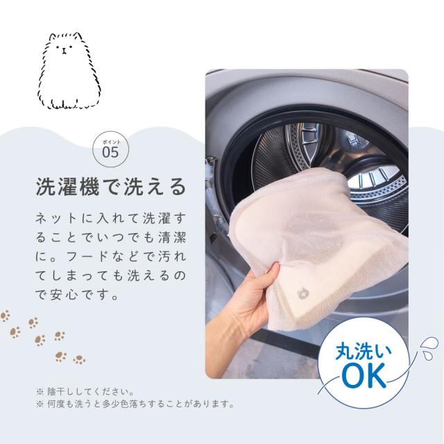 ネットに入れて洗濯することでいつでも清潔に。フードなどで汚れてしまっても洗えるので安心です。