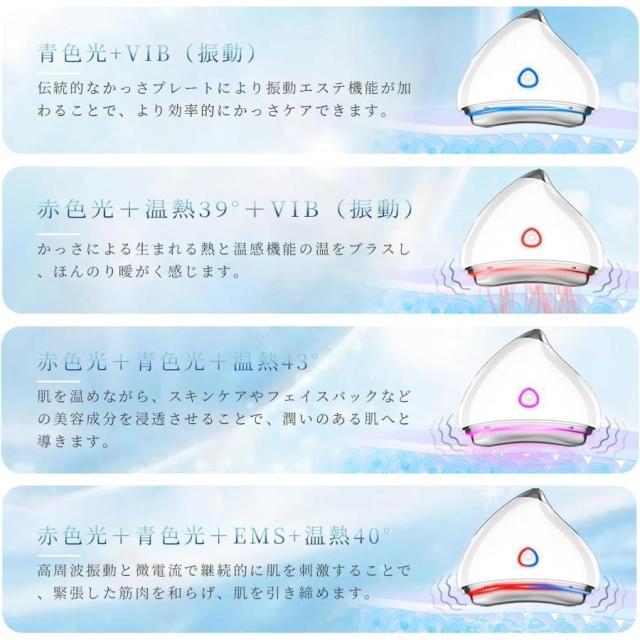 【1台4役】革新的な技術を採用した4つの機能を組合わせることで、リフトアップでむくみ悩みが解消する効果も。「温熱機能」高周波によって肌の内側からじんわりと温め、均一温度を保持できます、約39°?45° この温度で、どんどん気持ちよく出来ますので。「振動機能」従来のカッサプレートより振動機能が追加されていて、顔用だけではなく、くび、腕、足など体のどこでもご利用いただけます。「EMS微電流」が肌の筋膜群層をターゲットに、微妙な筋肉収縮によって筋肉のトーンとリフトを改善します。4つの異なるモードは、多くの人の異なる肌タイプと異なるスキンケアニーズを満たすことができます。ユーザーは自分の肌の状態とニーズに応じて適切なモードを選択することができます。