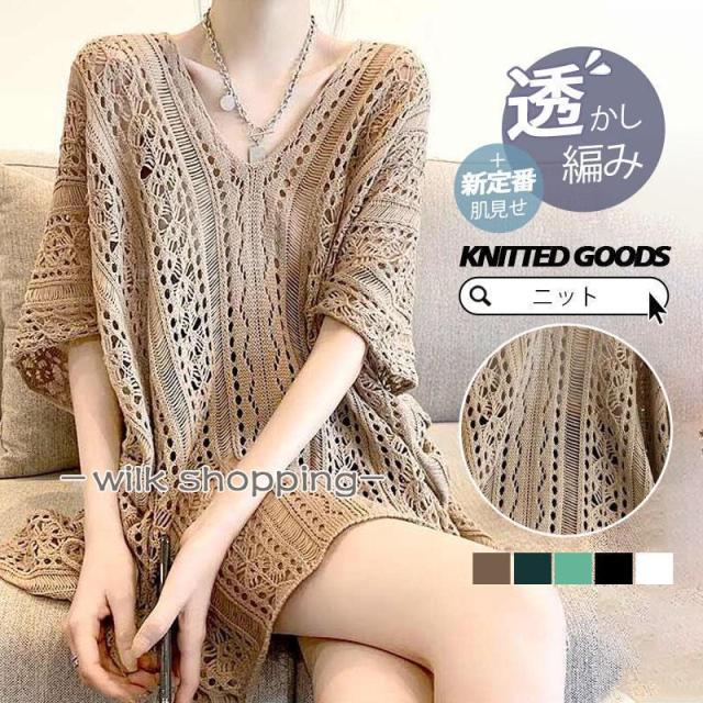 サマーニット レディース 半袖 トップス メッシュ編み プルオーバー 肌見せ ニットトップス ニット ドルマン カットソー 夏 透かし編み レイヤード 重ね着