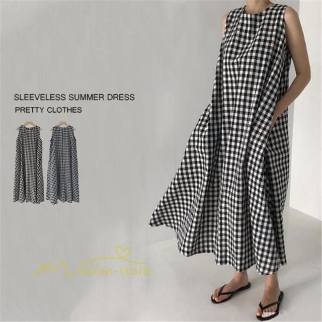 ワンピース レディース チェック柄 ノースリーブ 丸首 袖なし 夏物 春コーデ aラインワンピース 綿麻風 ロング丈 ミモレ丈 20代30代40代50代60代 かんたん