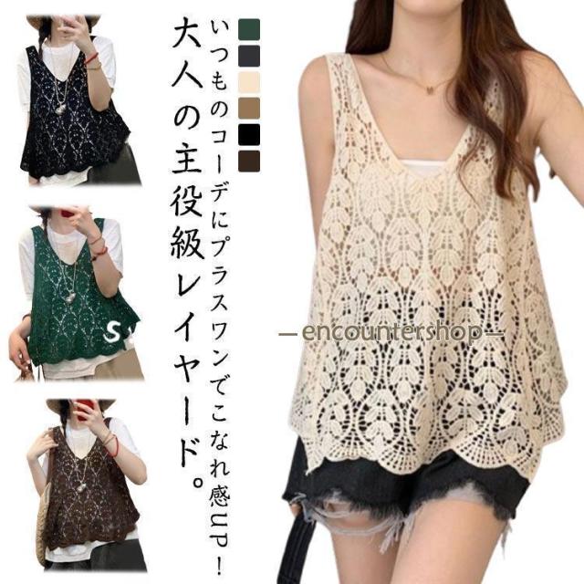 透かし編み ベスト レース ベスト レディース 春 夏 クロシェ編み トップス プルオーバー ニット サマーニット Vネック かぎ編み カジュアル 無