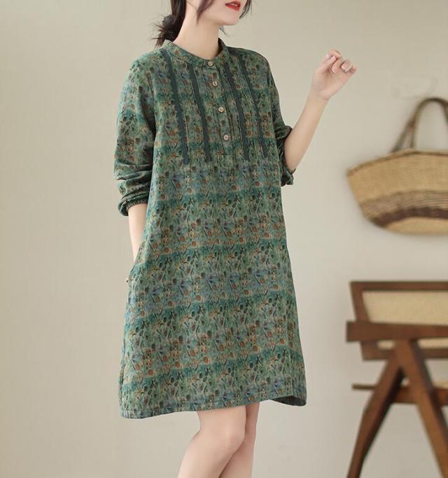 チュニックブラウス 花柄 レディース ロングシャツ 配色 長袖 プルオーバー スタンドカラー 綿麻風チュニックワンピース 切替 トップス コットン