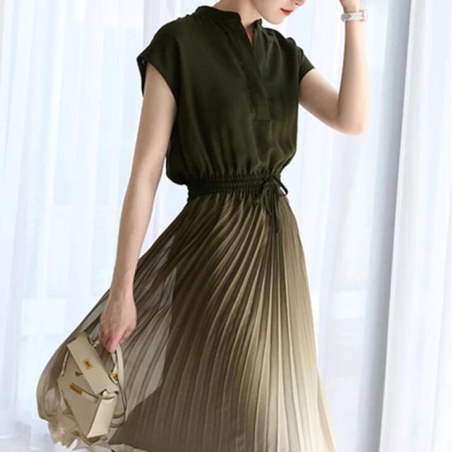 プリーツワンピース ワンピース 半袖 レディース マキシ丈 ロング丈 スタンドカラー 可愛いレディースファッション ワンピース