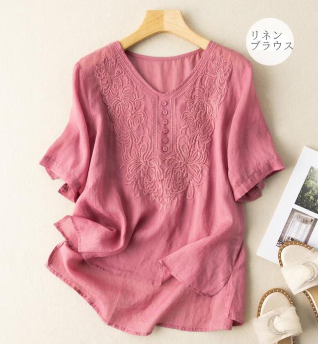 ブラウス レディース 夏 半袖 リネンブラウス トップス 無地 Vネック 綿麻 シンプル Tシャツ カジュアル 体型カバー きれいめ 通勤 OLリネン混 オフィス