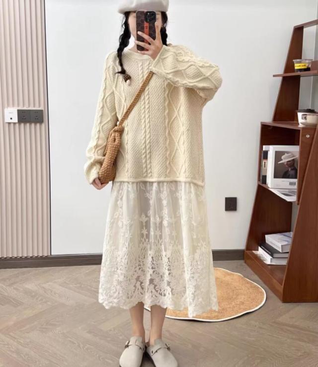 ペチワンピース ニットセーターセーター切り替えスカート総レース レディース レース レイヤード シンプル ロング 体型カバー