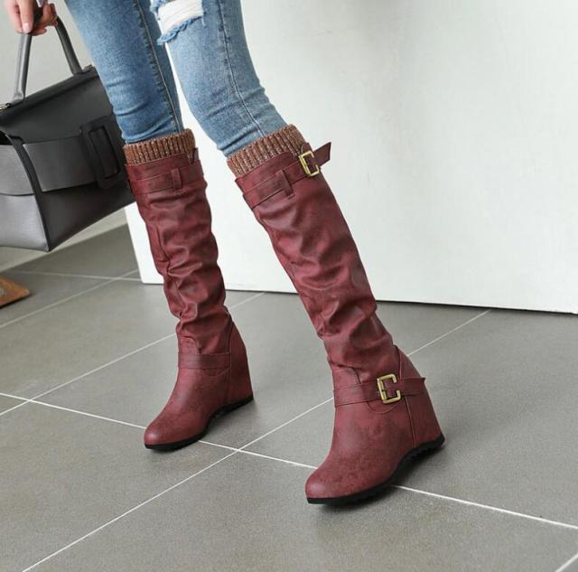 レディースブーツ ロングブーツ エンジニアブーツジョッキーブーツ 美脚 ヒール7.5cm ウェッジソール カジュアル シンプル