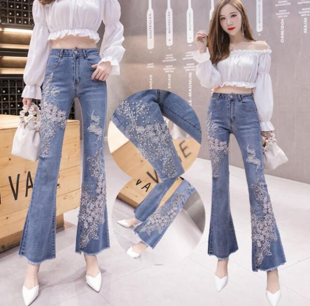 パンツ デニム ジーンズ ラッパパンツ ロング丈 レディース ベルボトム 無地 パンタロン 美脚 デニムズボン ハイウエスト ポケット付き 着痩せ