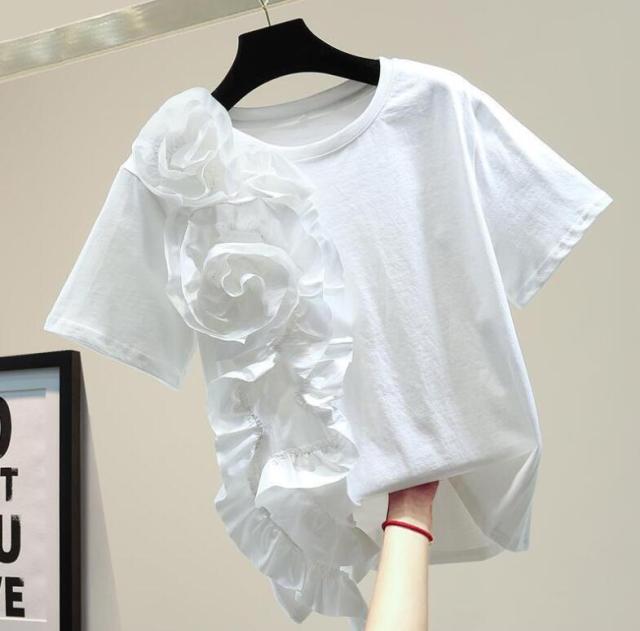 レディース カットソー Tシャツ フリル モノトーン 韓国 ファッション トップス 半袖 韓国 フレア 白 黒 Tシャツ 韓国 トップス アシンメトリー