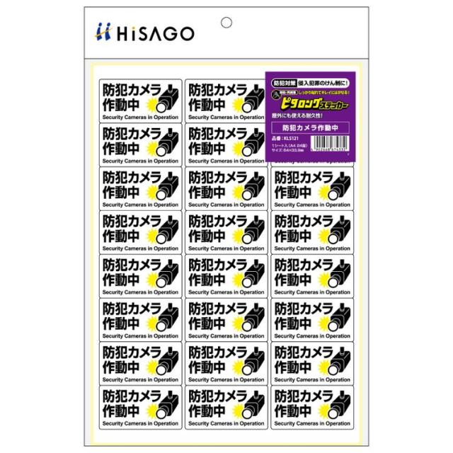【メール便発送】ヒサゴ はがせる!ピタロングステッカー (防犯カメラ作動中) A4 24面 1シート入 KLS121