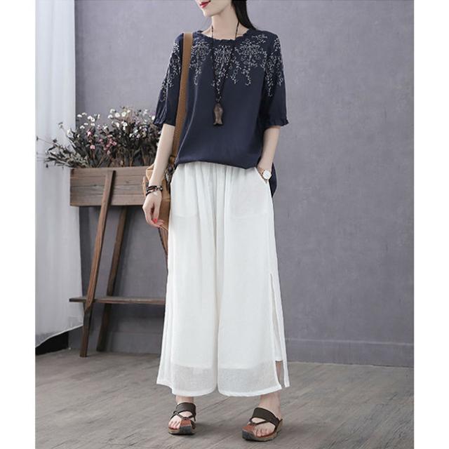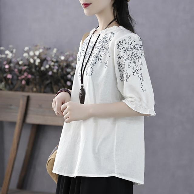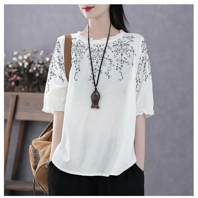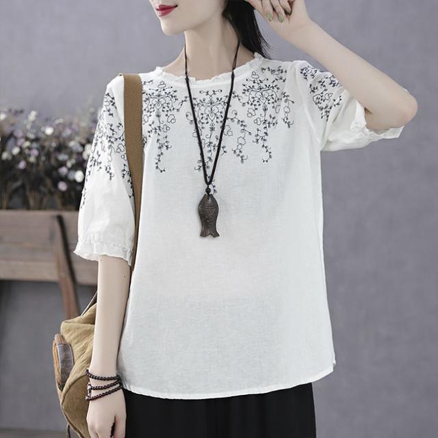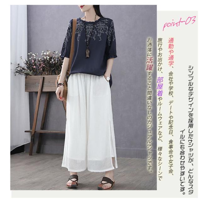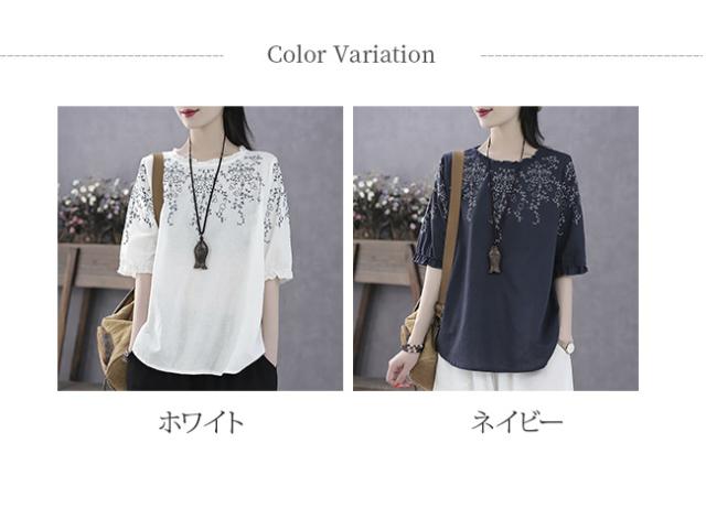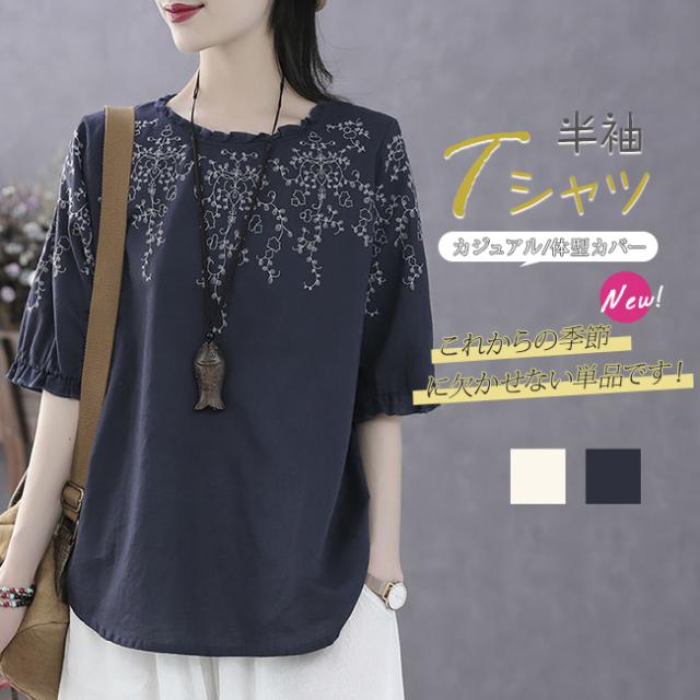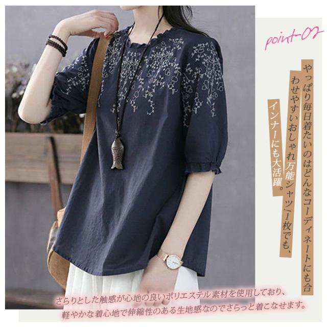 シャツ レディース ブラウス トップス 花柄 tシャツ プルオーバー カットソー チュニック リネンシャツ 夏服 刺繍 綿麻 カジュアル パフスリーブ 半袖 ボリューム袖 ゆったり 夏