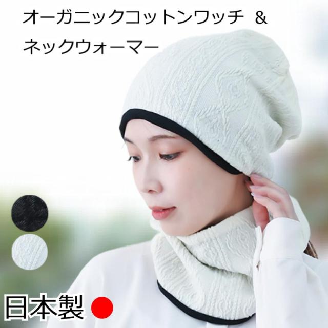 【日本製】オーガニックコットン ワッチ & ネックウォーマー セット ケーブルニット レディース 防寒 秋 冬用 帽子 室内帽子 外出用 医療用帽子 抗がん剤治療 脱毛ケア フリーサイズ 肌にやさしい 綿100% 綿 オーガニックコットンケーブルニット&ネックウォーマーセット