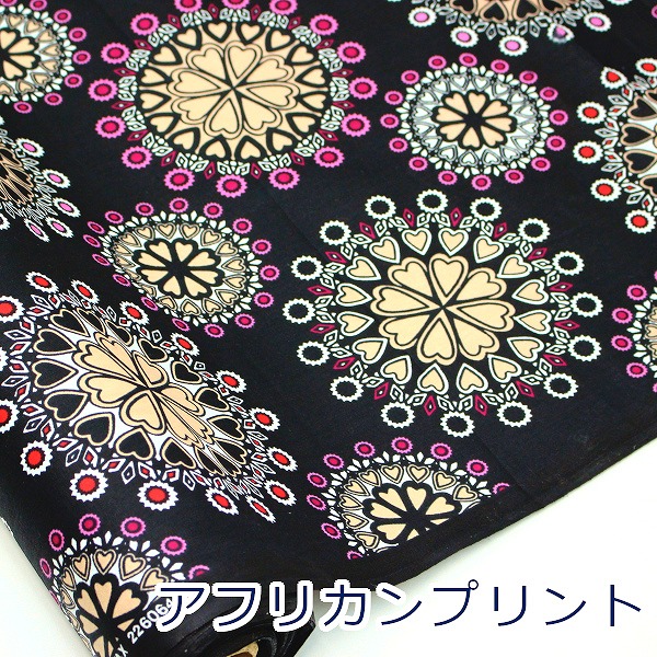 【10cm単位価格】 アフリカン プリント ブラック サークルフラワー ハート 花柄 カンガ 平織 綿100% 生地 布 約110cm幅 PRT-11933 ゆうパケット2m対応 ( ハンドメイド 手作り おしゃれ ワンピース 手芸 巾着 雑貨小物 インド製 )