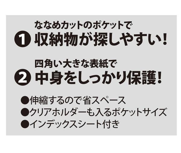 | 表紙に軽くて丈夫な発泡PPを使用した自立するドキュメントファイルです。ななめカットのポケットで収納物が探しやすくなっています!! |