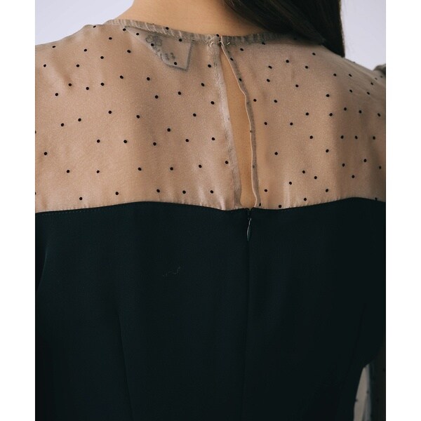 デコルテから袖にかけてのシースルー素材が大人っぽさを演出し、フロッキー素材のドットが可愛らしさと季節感をプラスしてくれる、上品さ溢れるブラウス。