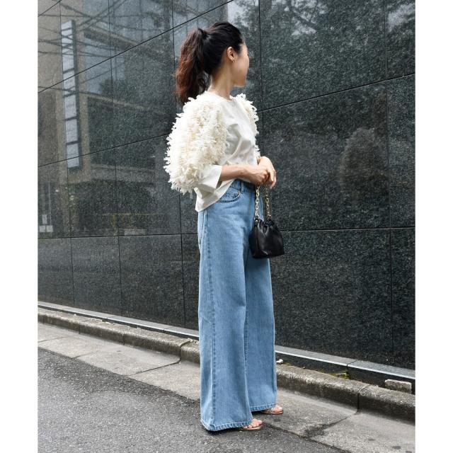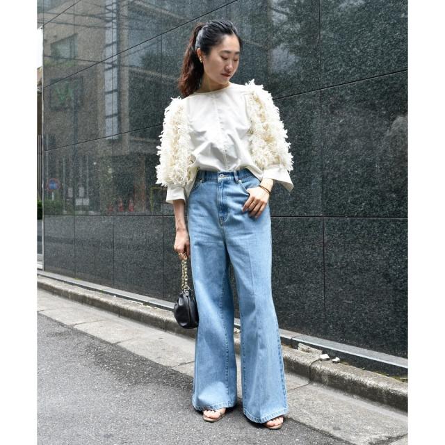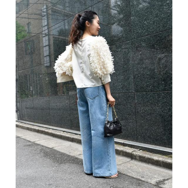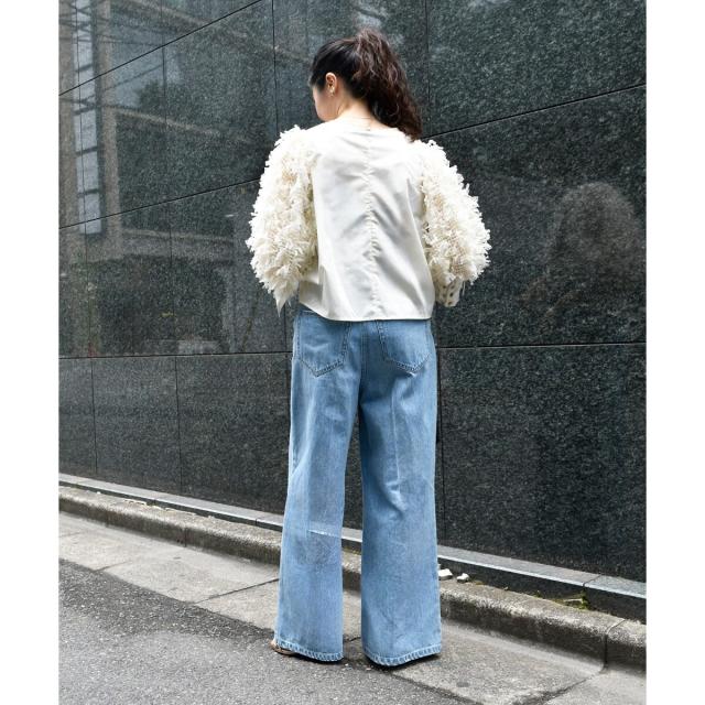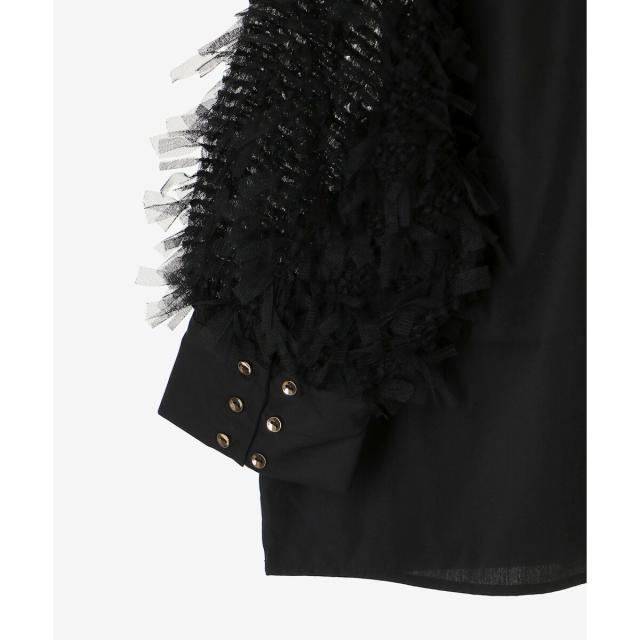 身頃にはシャツ生地、袖にチュールフリンジのように編み込まれたファンシー生地を使用し一枚でパッと華やかなブラウス。