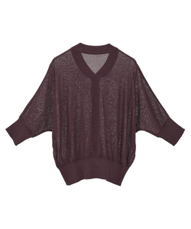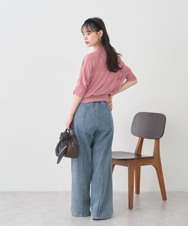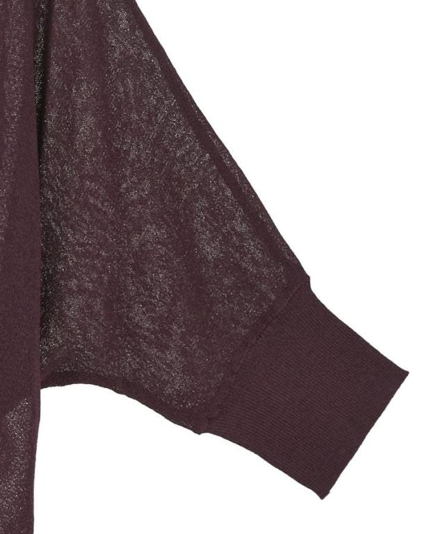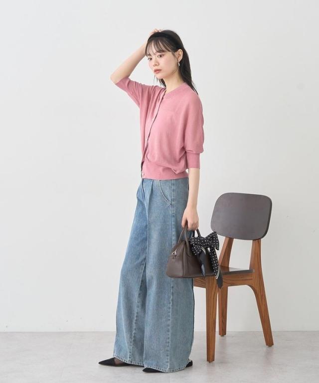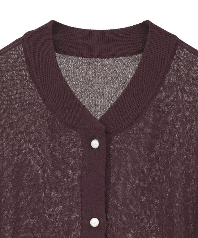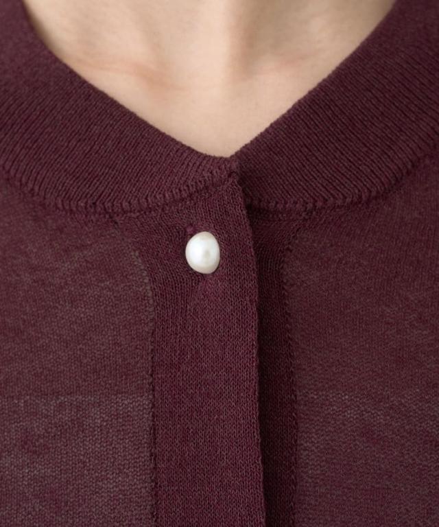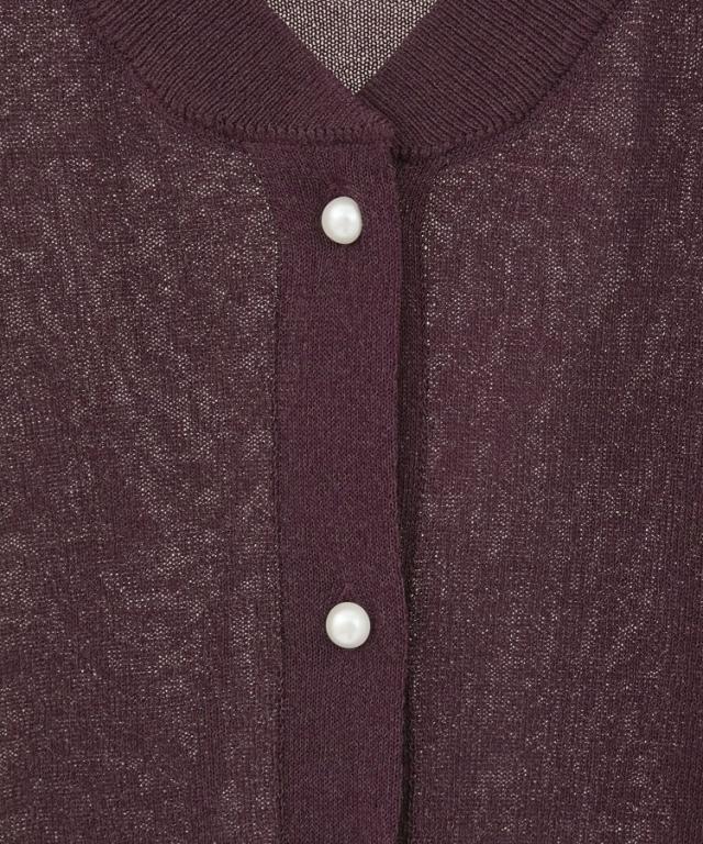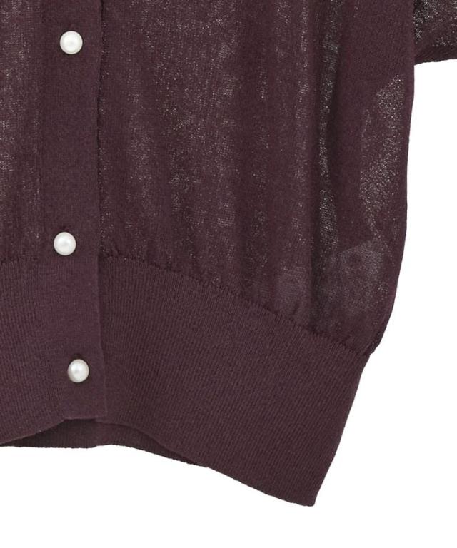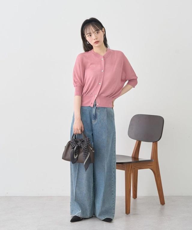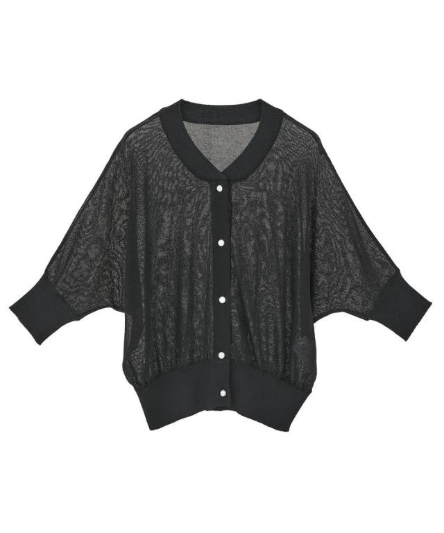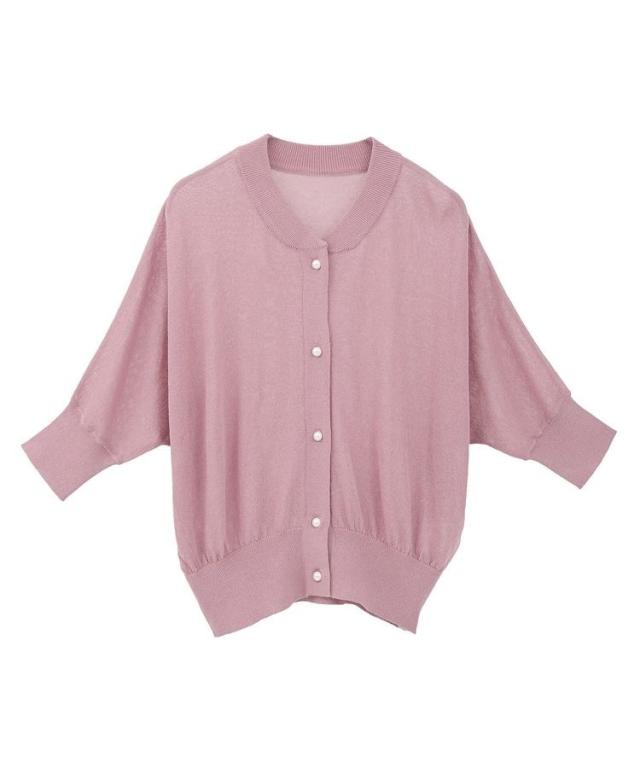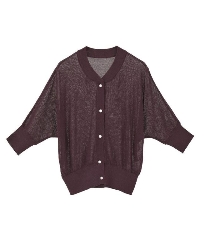 パール調ボタンがフェミニンに映えるシアーニットカーディガン。程よいコンパクト丈にゆったり感のあるドルマンスリーブがふんわりと女性らしいシルエットを演出します。触れるとひんやり涼しい接触冷感素材で、暑さの残る季節にも爽やかな着心地。ワイドパンツやフレアスカートと合わせるだけでトレンドスタイルが決まるおすすめの一枚です。透け感[ややあり]