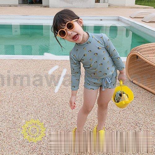 子供水着 3点セット キッズ 長袖 レモン キャップ付き セパレート 男女兼用 タンキニ ジュニア ラッシュガード 女の子 ガールズ スクール水着