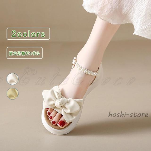 ビーチスリッパ レディース 無地 パール リボン フラットサンダル ストラップスリッパ ゴムサンダル 厚底サンダル 通気性 美脚 カジュアル 柔らかい