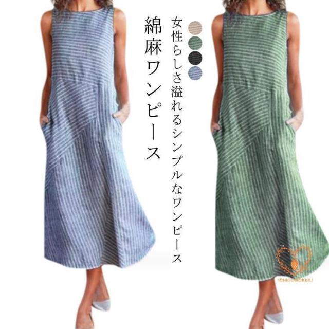 ロングワンピース コットンリネン ワンピース 綿麻ワンピース ロング丈ワンピース 涼しい ストライプ柄 レディース ノースリーブ ナチュラル 麻混 夏