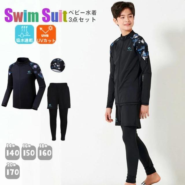 水着 子ども 男の子 中学生 スクール水着 男子 ラッシュガード 小学生 3点セット 上下 長袖 長ズボン レギンス スイムキャップ ハーフパンツ 140 150 160 170