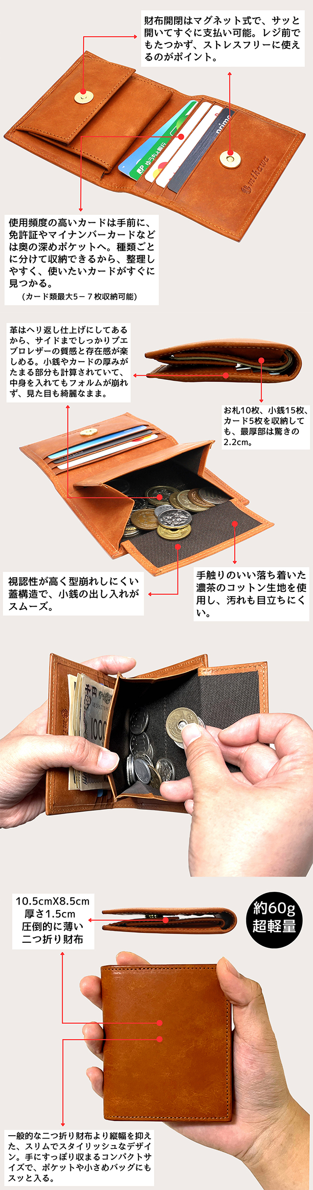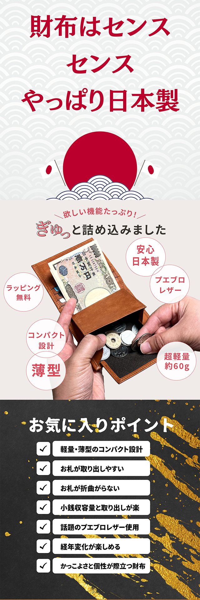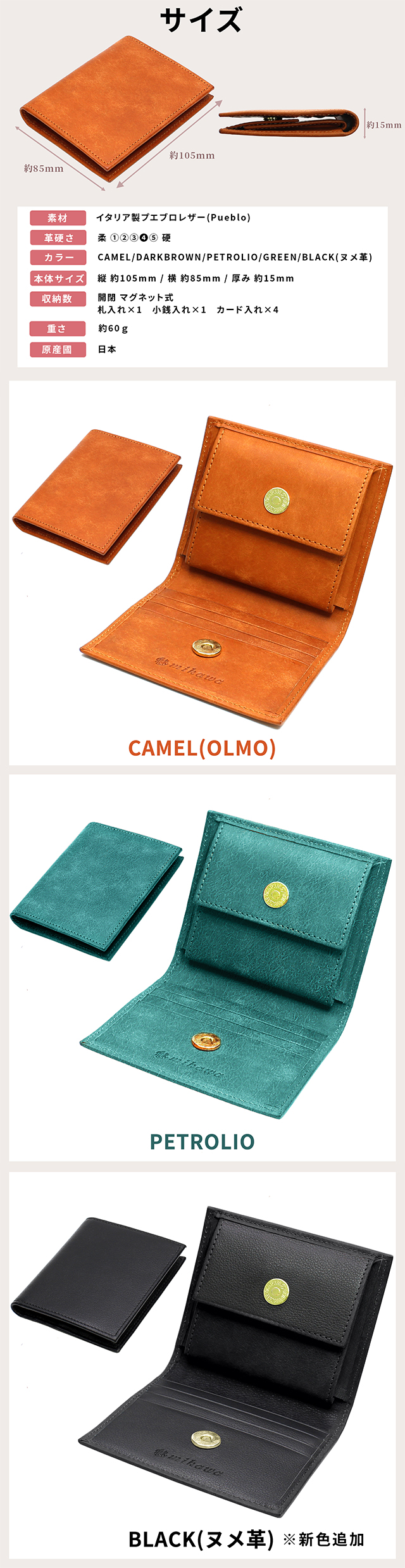 ● 薄型財布や軽量財布、コンパクト財布、二つ折り財布の本革タイプ、日本製の財布を求める方におすすめです。
