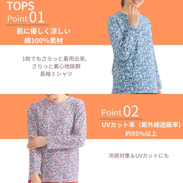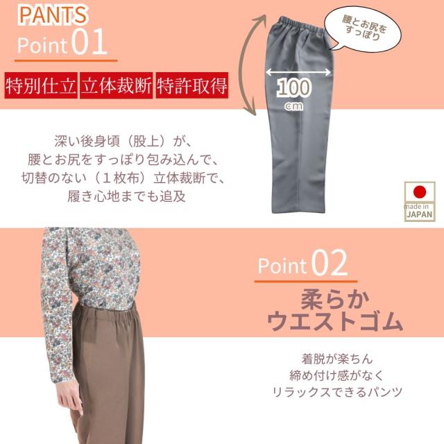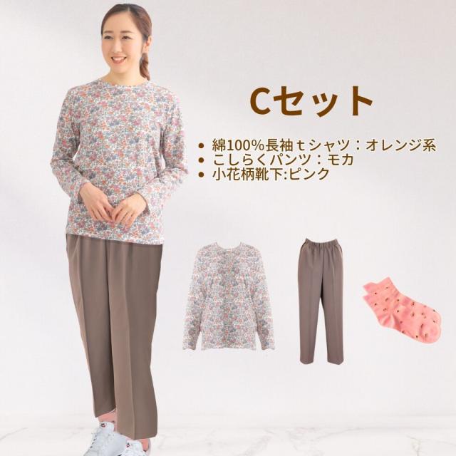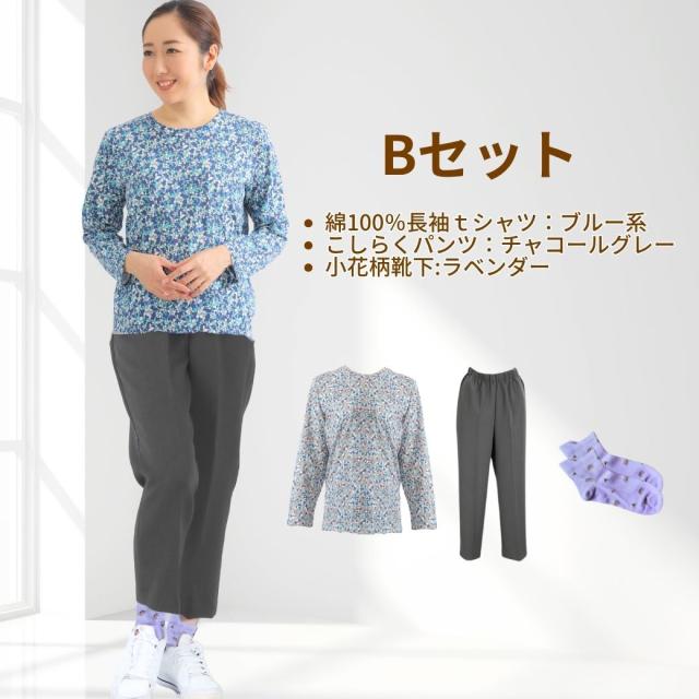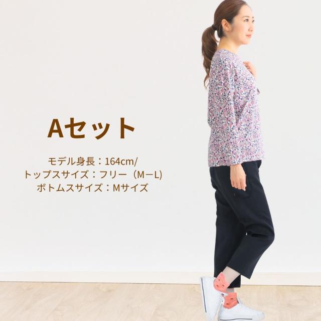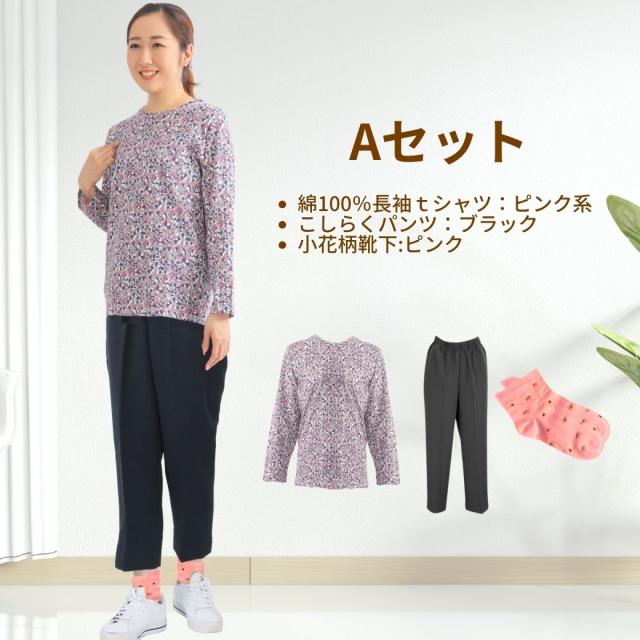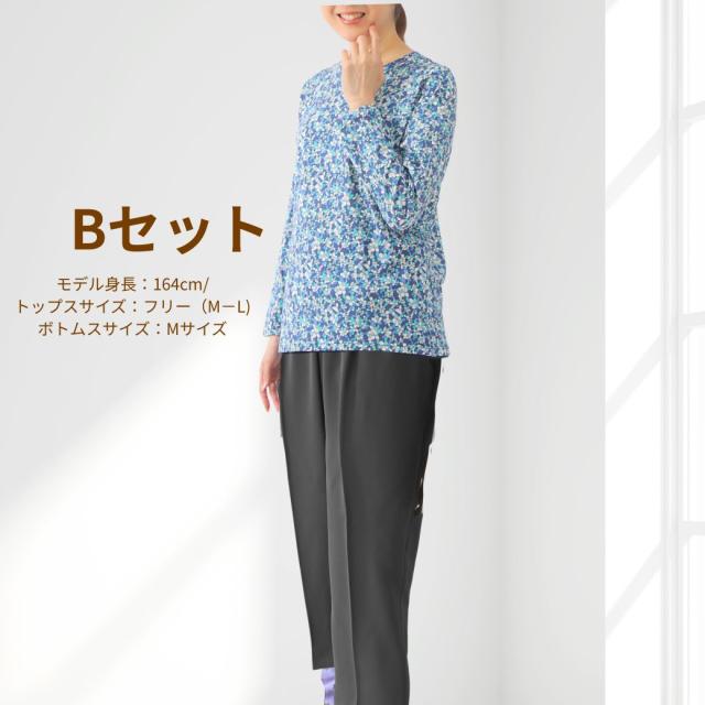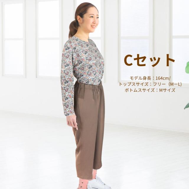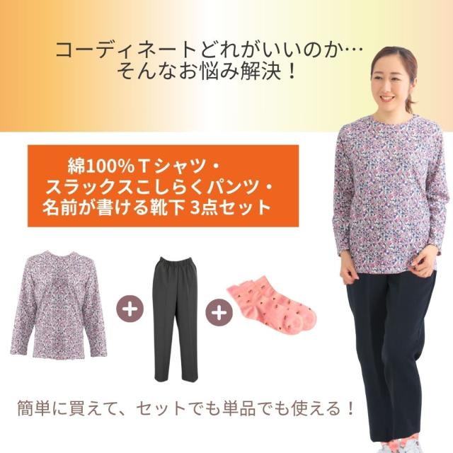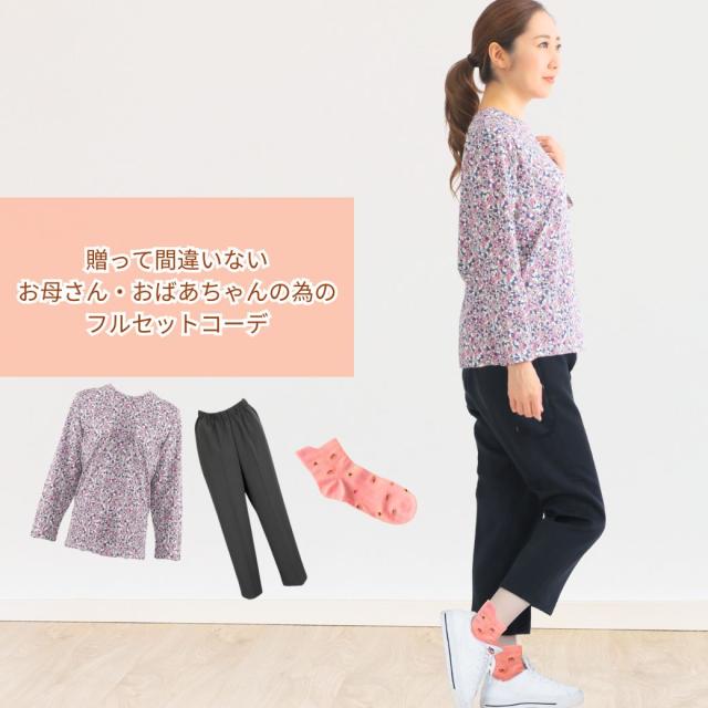 ★サイズ トップスサイズフリー(M-L)着丈:60 袖丈:54 バスト79−94 肩幅40 Mサイズ ウエスト64.0-70.0 股上(前)27.0 股上(後)46.0 股下58.0 裾幅18.0Lサイズ ウエスト69.0-77.0 股上(前)28.5 股上(後)48.0 股下58.0 裾幅18.5LLサイズ ウエスト77.0-85.0 股上(前)29.0 股上(後)50.0 股下58.0 裾幅19.0靴下サイズ23-25cm/25-27cm単位(cm)★素材 トップス:綿100%ボトムス:ポリエステル100%靴下:ポリエステル 綿 ポリウレタン★特徴 年齢を重ねても、毎日はもっとおしゃれに、もっと快適に。そんな願いを叶える「シニアレディース3点フルセットコーデ」が登場しました。トップス、パンツ、ソックスの3点がセットになったこのアイテムは、落ち着いた花柄デザインと動きやすいシルエットで、シニア世代の女性にぴったり。ゆったりとした着心地で、おうち時間はもちろん、ちょっとしたお出かけにも大活躍します。トップスこちらのtシャツは、シニアレディース向けファッションです。介護施設に入所されているお母様に、最適です。綿100%の長袖tシャツ プルオーバー です。肌の露出を抑えて、転倒、打撲から、腕を守ります。エアコンのきいた室内でも、綿100%の長袖tシャツなので快適に過ごせます。もし、汗をかいても、綿100%のtシャツですので、汗を吸います。リーズナブルな価格で、洗濯機で、イージーケア出来ます。ボトムスシニアのミセスのために考えられた特許取得の特別なズボンです。後ろが長く設計されています。継ぎ目なく一体構造が特許です。継ぎ目が無いからはき心地よくゴロゴロ感がありません。かがんでも、背中の見えない安心デザインです。深い股上と長い後身頃が特許です!丈直しの手間もいらず、買ってすぐにご着用頂けます。ポケットは前側に2つ物が落ちにくい深めに作られています。ポケットは前側に2つ、携帯電話もすっぽり入る深めに作られています。介護する人もされる人にも優しいスラックス。長く履いて頂けるようにゆったり作られています。締め付けの負担が軽減出来るようにウエストのゴムは調節出来ます。ご家庭で繰り返しお洗濯出来ますのでとっても経済的です。多くの方にご愛用頂けるようシンプルでスッキリしたデザインになっています。シニアのご婦人に合せた丈直し不要の丈の長さになっています。お買い上げ頂いてすぐにご着用頂けます。【1003782】※車いすをご使用の場合股下が短すぎるとスソが上がり過ぎて脚の冷えにつながりますので適度な長さの股下商品をお選び頂くことをおススメしています。落ち着いたカラーで合わせやすくなっています。靴下足底に名前が書けて便利です!綿混素材でさらっとしており、家庭洗濯できます履き口ゆったりしていて、ゴム無しで締め付け解消!すべり止め付きで安全!★注意事項 ■肌に合わない場合は、着用をおやめくだざい。■商品の撮影には最大限注意を払っておりますが、閲覧時のモニター環境によりましては実際の商品と若干違うお色味に映ることもございます。
