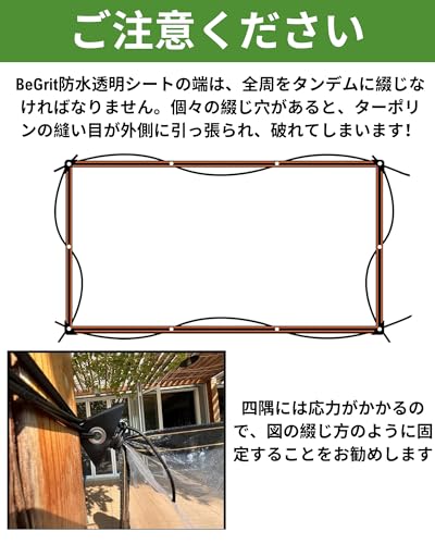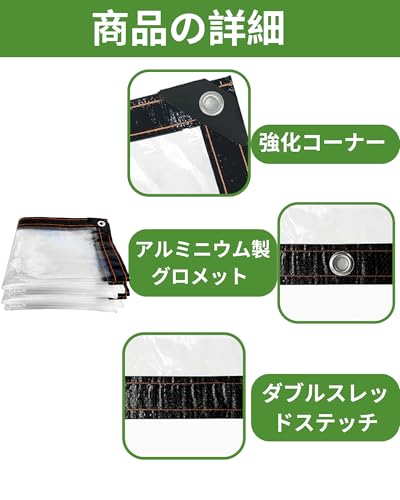 【雨避けシート-エッジ補強】クリアタープは、丈夫で頑丈なEVAタープです。防水透明ターポリンのエッジは、ダブルステッチの縫い目で補強されています。サビに強いアイレットが耐久性を確保し、しっかりと固定されます。金属製のアイレットはタープの1メートルごとに配置され、コーナーと補強されたエッジは丈夫で耐久性のある三角形のゴムで包まれ、タープを素早く簡単に固定できます。