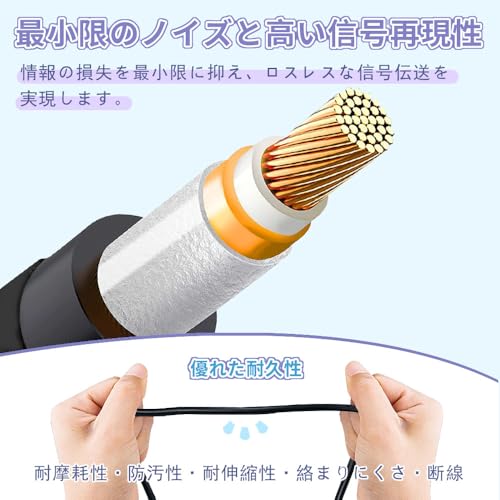 【最小限のノイズと高い信号再現性】このケーブルは22AWGの無酸素銅を導体に使用し、情報の損失を最小限に抑え、ロスレスな信号伝送を実現します。PVC絶縁材と高密度の撚り線銅ケーブルがシールドとして使用され、外部からの干渉を強力に遮断。外部ノイズの影響を最小限に抑え、クリアで美しいステレオサウンドを実現します。