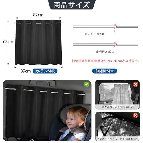 【取付簡単】カーテン4枚セット、サイズ:幅82cm、丈68cm;繋ぎ棒:46cm〜82cmで調整可能、;フックを左右のピラに差し込んで、車の幅に合わせて、伸縮棒を調節して、カーテンを伸縮棒に通して、フックに掛けて完成、とても簡単です