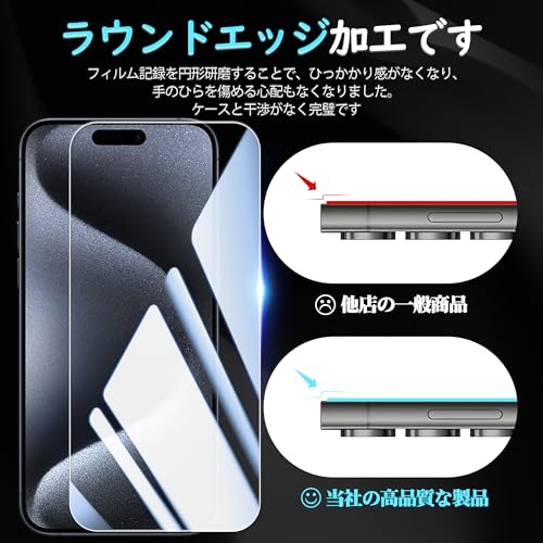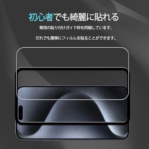 【対応機種】iPhone 15 Pro 用 ガラスフィルム2枚 + いphone15pro 用カメラ保護 フィルム2枚 + iphone15pro 用 フィルム ガイド枠付き1枚。【注意】この電話の画面の端は湾曲しているため、保護フィルムのサイズが丁度良い場合、しっかりと貼り付けられず、白いエッジやシェルとの干渉などの問題があるため、保護フィルムは画面よりも小さいです。