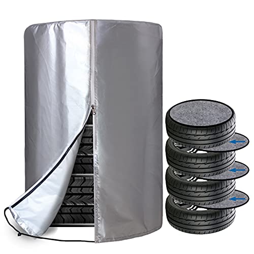 タイヤカバー 軽自動車用 屋外 フェルトパッド4枚付き 幅65×高さ90cm タイヤ 4本 収納 保管カバー 420D 厚手 防水 紫外線 劣化 汚れ防止 耐久 収納袋付き シルバー (14 / 15 / 16インチ)