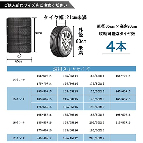 【収納バッグ付き】タイヤカバー直径65cm 高さ90cm、外径63cm未満のタイヤ4本を収納可能。収納バッグ付き、使わない時、収納袋に入れて、コンパクトで持ち運び安くて、スペースもとらないです