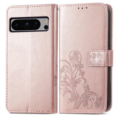 Google Pixel 8 Pro ケース 手帳型 四葉のクローバー エンボス加工 PUレザー フリップ 薄型 軽量 カード収納 革ケース マグネットブラケット TPU シリコンベース 363°フルプロテクション