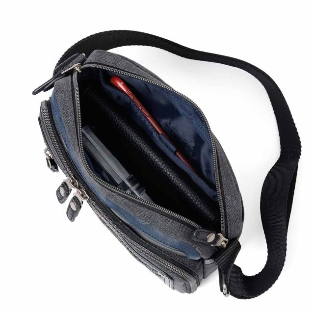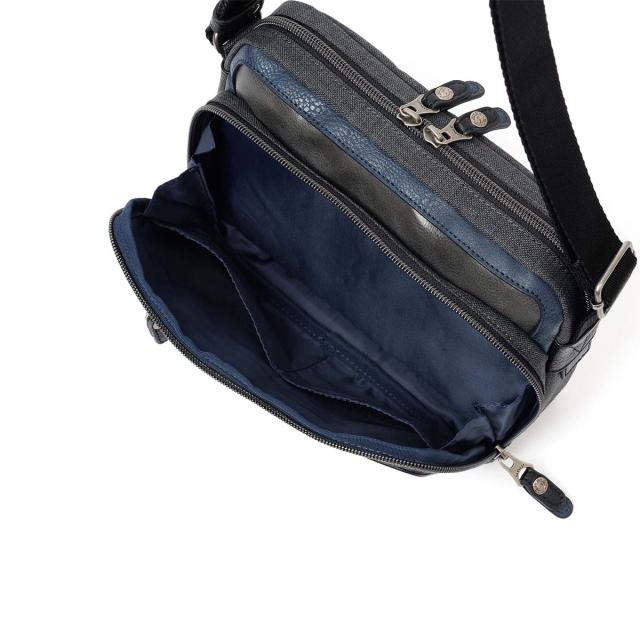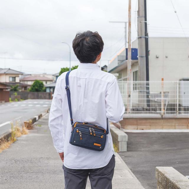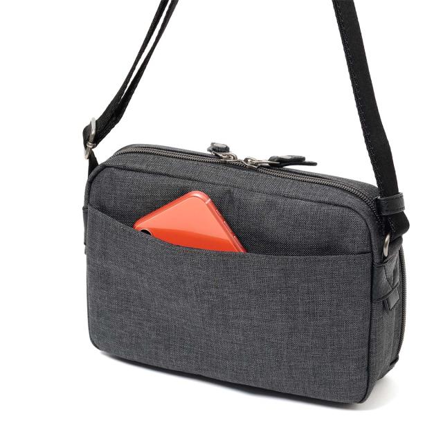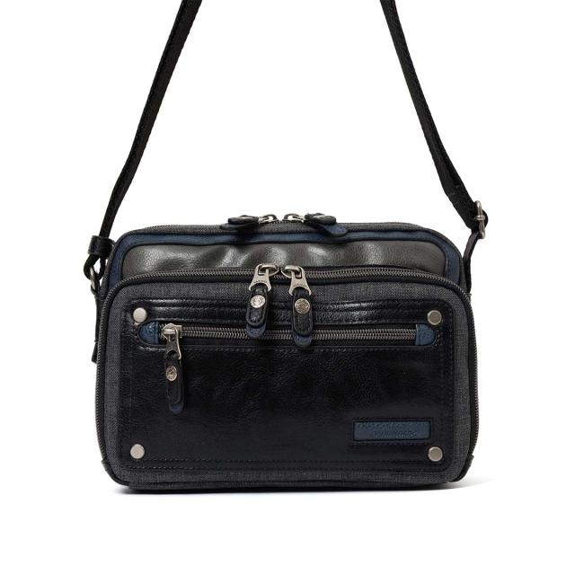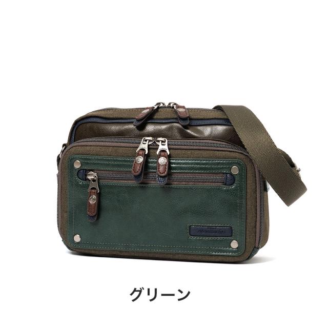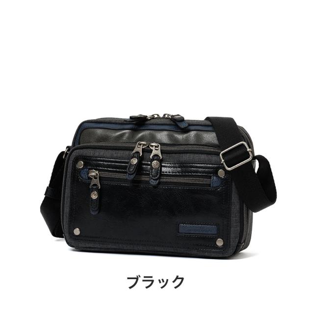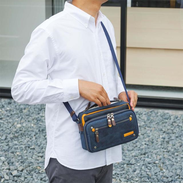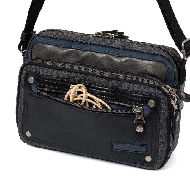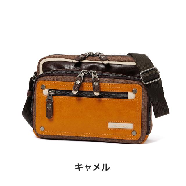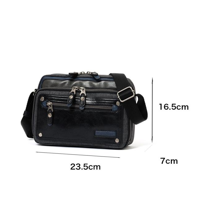 合皮とポリエステル生地を組み合わせたおしゃれなショルダーバッグ。コンパクトなデザインながらポケットも充実しており、財布・スマホなど、必要アイテムをしっかり収納でき、ちょっとした外出、旅行時のサブバッグにも最適なアイテムです。