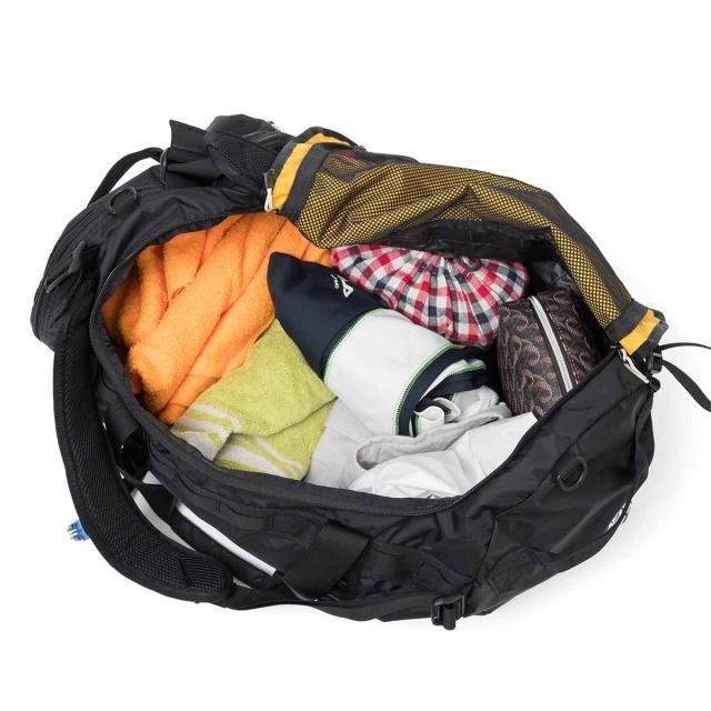 D型に大きく開くメインコンパートメント。取り外し可能なショルダーストラップと、便利なグラブハンドルを配備し、荷物の量やフィールド状況に合わせた多彩な持ち方が可能。チェストベルトは、安全性を考慮した、一定荷重での開放式バックルを採用しています。