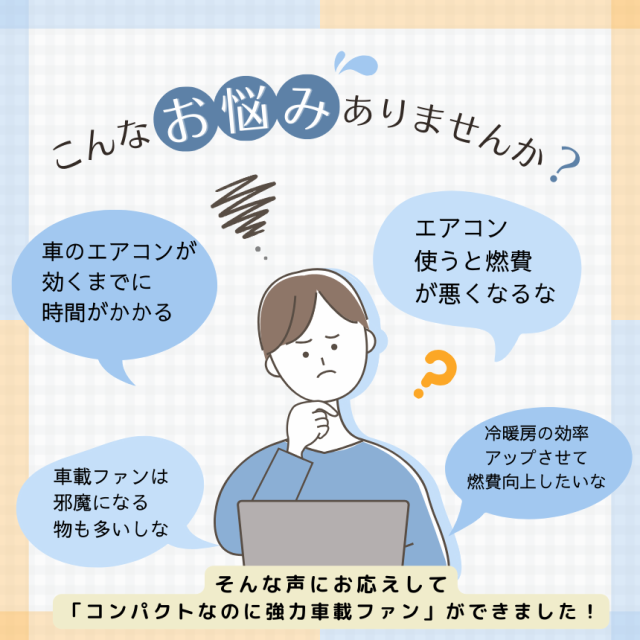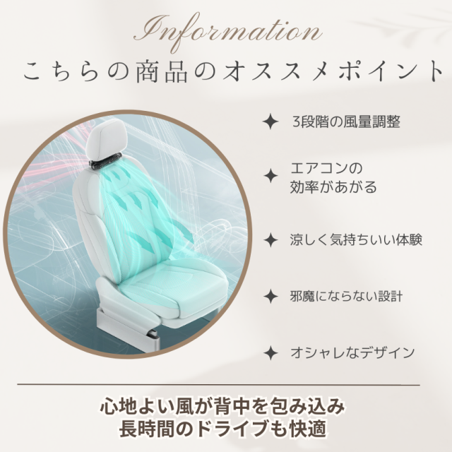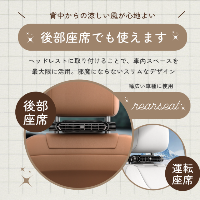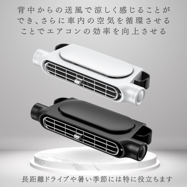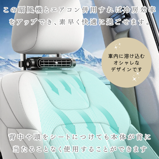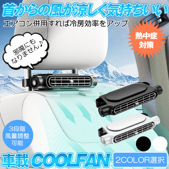 夏場の暑い車座席に設置して、背中に送風できる車用クールファンが登場!体積が小さくて空間を占めなくて、車内において邪魔になりません。ヘッドレストに取り付けることで、背中や頭をシートにつけても本体が首に当たることなく使用することができます。この扇風機とエアコン併用すれば冷房効率をアップでき、涼しい雰囲気を与えます。