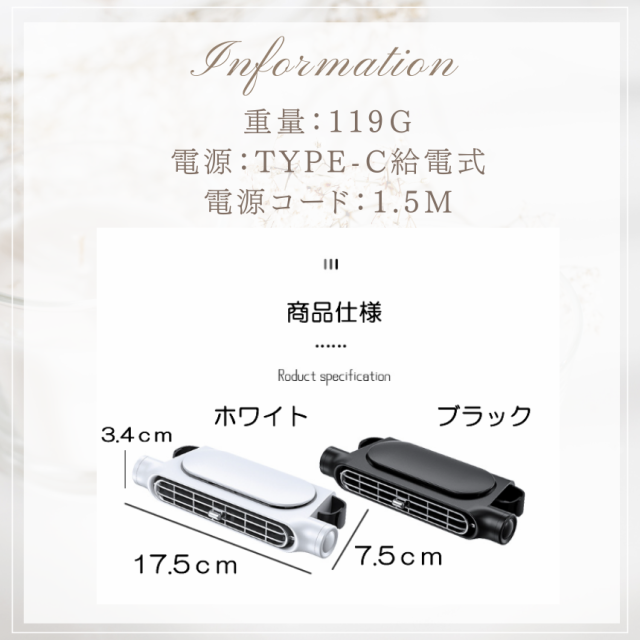 コンパクト設計で、つけていても目立たず見た目いい感じ?無駄な機能を省いているのでスマートに使えます。本体は、ブラックとホワイト、お好きなカラーをお選びください。