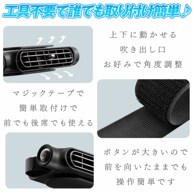 取り付けは、ヘッドレストにマジックテープでサッとつけるだけ?付属のUSBのコードでつないで大きくて押しやすい電源を入れればあっという間に送風開始。3段階で風量も調節できます。乗ってすぐの熱い車内で首元から体温を下げる、エアコンをいつもより弱めて省エネ、あると必ず役立つ便利グッズです?