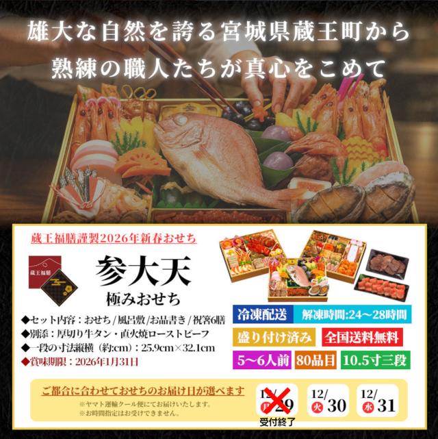 おせち おせち料理 予約 おせち予約 おせち2026 おせち2025 おせち2024 2025 2024 2023 おすすめ 定番 有名店 種類 冷凍 冷凍おせち 歳暮 お歳暮 ギフト お返し 人気 人気ランキング ランキング レビュー 口コミ 評価 評判 和風 洋風 中華 和洋中 和洋折衷 送料無料 カタログ 取り寄せ お取り寄せ お試し おためし 大晦日 お正月 御正月 新年 来年 お節 お節料理 蔵王福膳 福膳 元日 元旦 年末 年始 年末年始 令和 クーポン ポイント ポイント消化 蔵王 福膳 伊達百万石 伊勢海老 鮑 有名店 おせち人気 おせち人気ランキング おせち個別 個別 おせち料理セット お取り寄せ お重 お年賀 ギフト ごあいさつ 家族向け 家族団らん 家族団欒 御歳暮 御正月 御節 御年賀 御年始 行事食 三が日 取り寄せ 重箱 上質 新年 節供 全国配送 宅配 日時指定 年末年始 和洋 和洋折衷 福袋 おせち福袋 ふくぶくろ ガチャ 早割 早割り