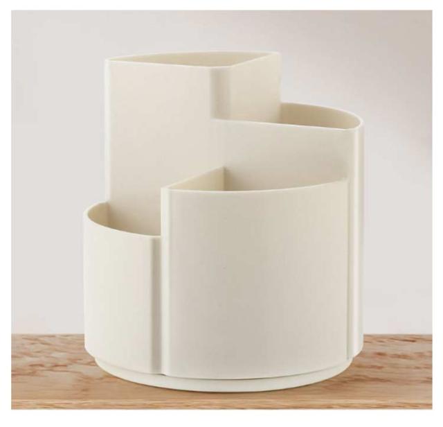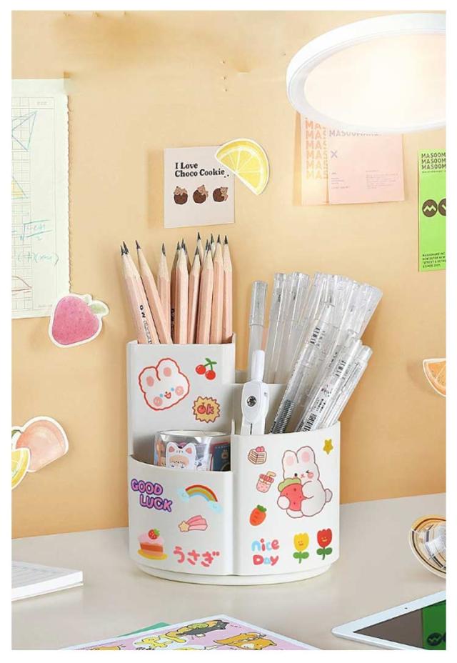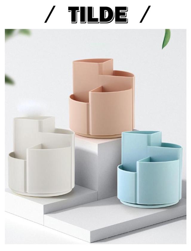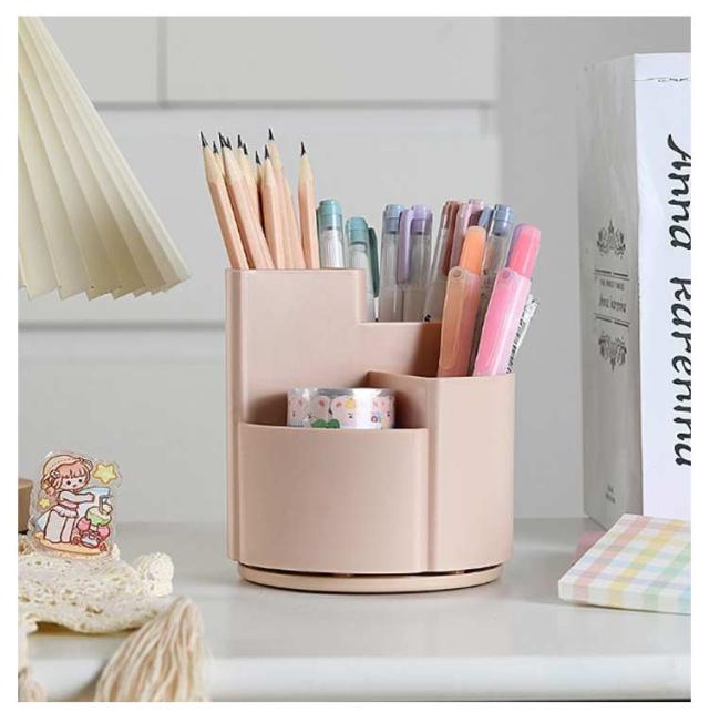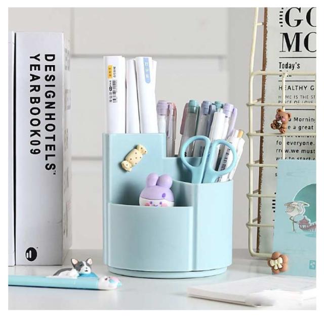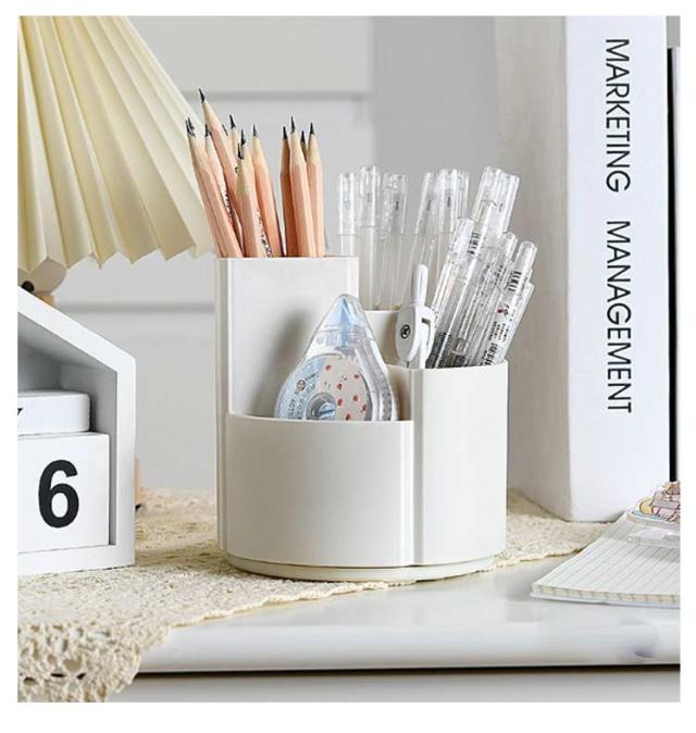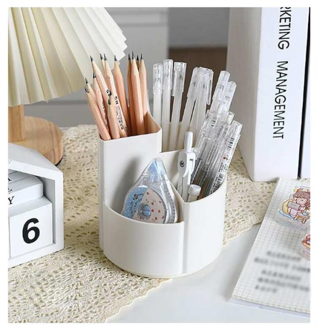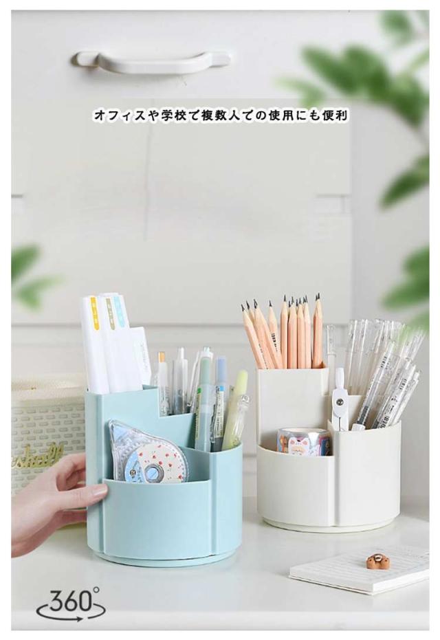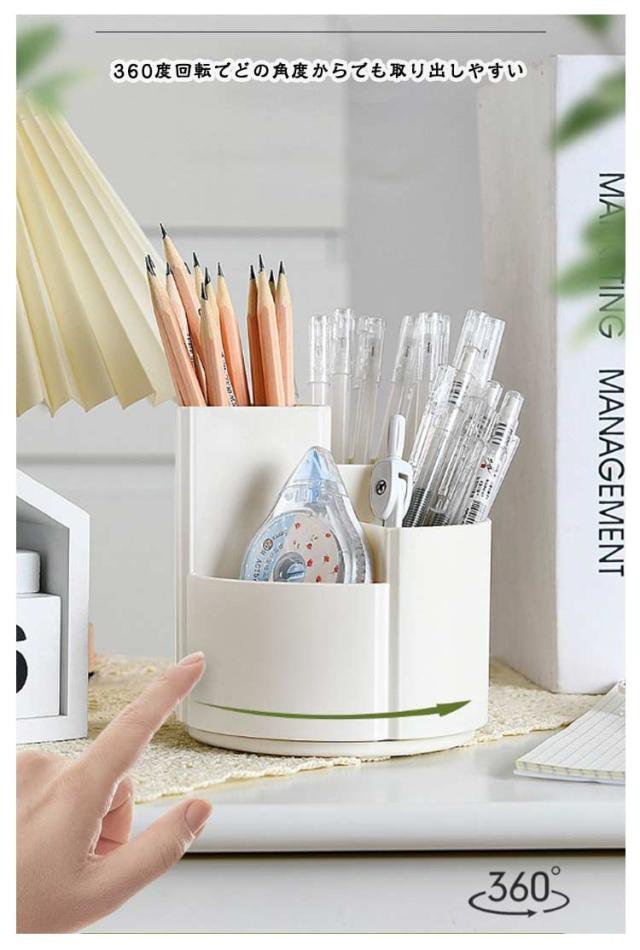 | シンプルな大容量の360度回転式ペン立て。 360度回転でどの角度からでも取り出しやすい 3つのポケットでアイテムを分類収納可能 段違いデザインで小物も見やすく取り出しやすい デスクの端に置いても省スペースで使える オフィスや学校で複数人での使用にも便利 | |