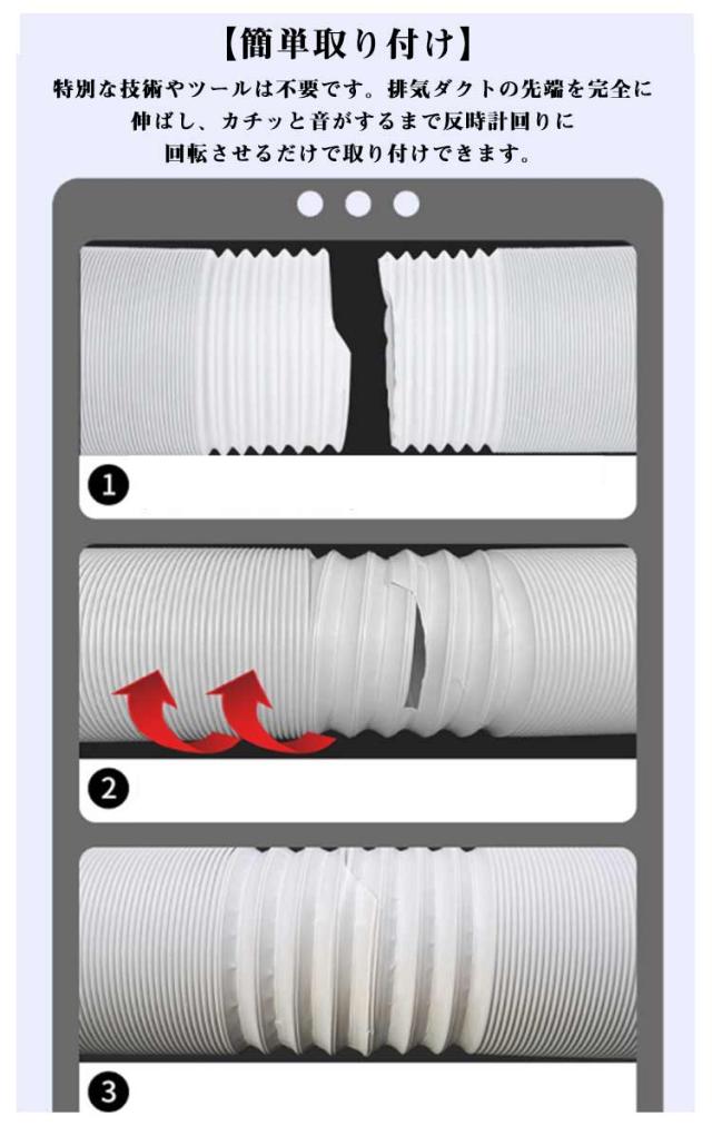| 【延長排気ダクト】 【3M 2M】 【高品質なPP素材】柔軟性に優れ、耐久性も備えた高品質なポリプロピレン製です。持ち運びにも便利です。 【伸縮式設計】日常の収納性を考慮し、伸縮式でデザインされています。室内移動式エアコン用にぴったりです。 【簡単取り付け】特別な技術やツールは不要です。排気ダクトの先端を完全に伸ばし、カチッと音がするまで反時計回りに回転させるだけで取り付けできます。 | |