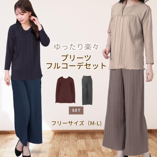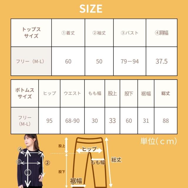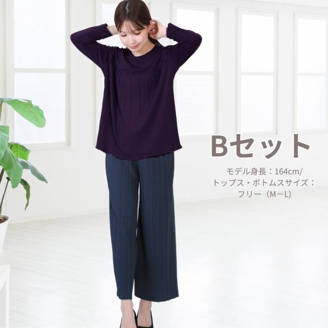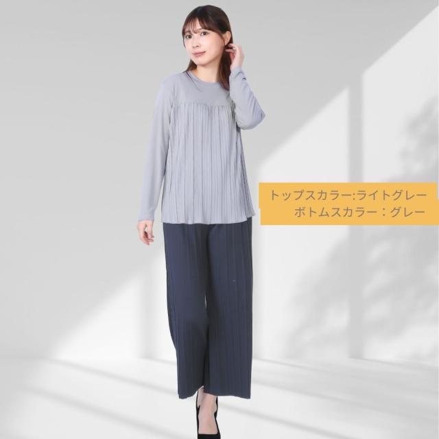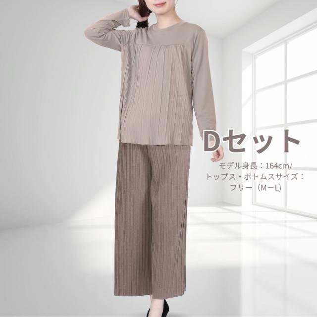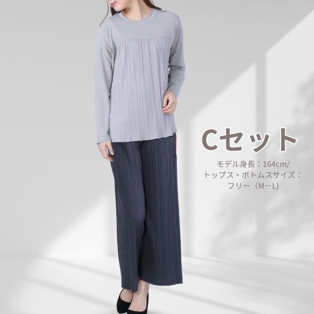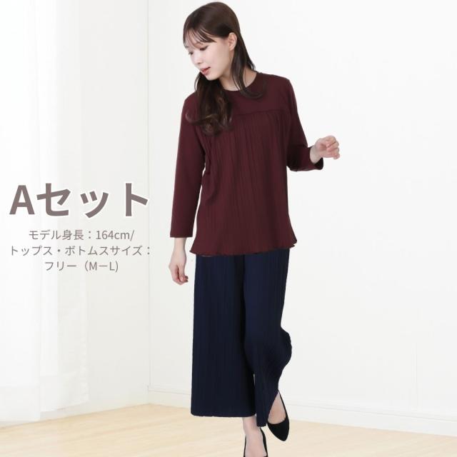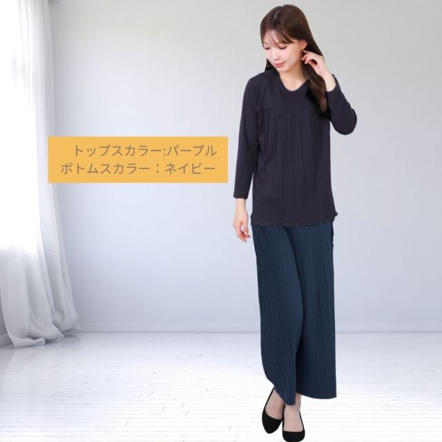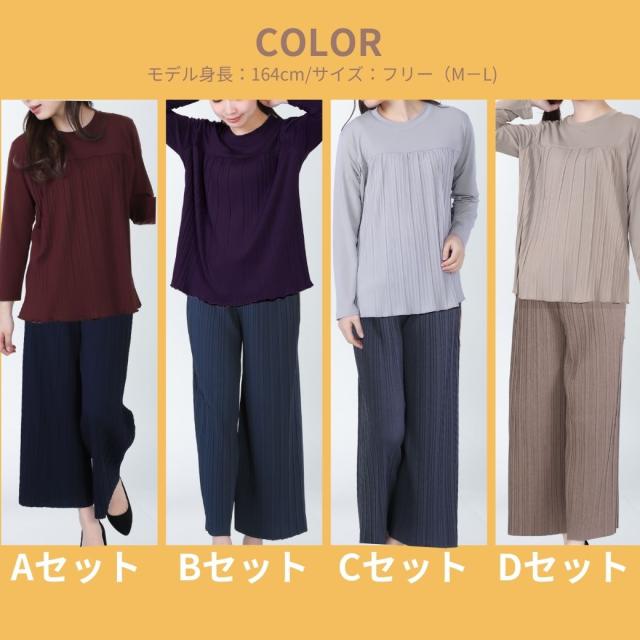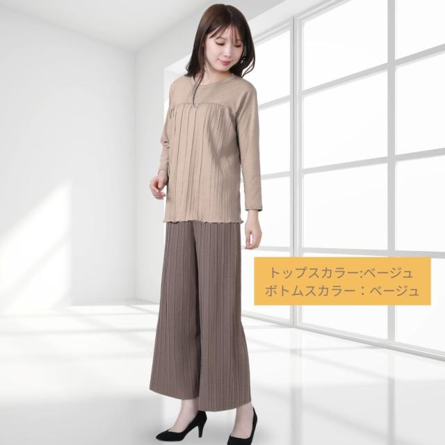★サイズ トップスゆったりフリーサイズ(M-L)着丈60cmバスト79-94cm肩幅37.5cm袖丈50cmボトムスゆったりフリーサイズ(M-L)ヒップ:95 ウエスト:68−90 もも幅:30股上:33 股下:60 裾幅:31 総丈:88 単位(cm)※サイズは製品によって多少の誤差が御座いますご了承くださませ★カラー トップス ワイン・パープル・ライトグレー・ベージュボトムス ブラック・ネイビー・グレー・ベージュ★素材(生地・毛糸) トップス:ポリエステル95%ポリエステル5%ボトムス:ポリエステル95%ポリウレタン5%★柄 無地生地はプリーツの凹凸感あり★テイスト(ファッション) カジュアルオフィス・ビジネスキレカジシンプルフォーマル★洗濯表示 家庭洗濯★シーズン 春・夏・秋 通年★パンツ脚幅 ワイド★商品説明 セットアップで簡単に買えてコーディネートし易い!ニコ森おすすめオシャレコーディネート!そして上下サイズ フリーサイズ!贈り物にも自分用にもおすすめ!長袖商品は肌の露出を控えて日焼け防止効果が期待できます。夏の紫外線カット効果が期待できます。伸縮性抜群でストレッチ素材。着脱簡単で動きやすいITY素材で糸の強度が高く、素肌のようなやわらか触り。型崩れが少なく、美しいシルエットを保ち、乾きが早くシワになりにくい着回し抜群。上品でシンプルなデザインなのでどんなボトムスにも合わせやすい高級感ある素材のプリーツパンツが出ました!色はブラック・ベージュ・ネイビー・グレーの4色。通年用は重厚感があり高級感があります!表記はフリーサイズ(M-L)ですが、当店スタッフも試着してみました。すると普段5Lサイズ利用のスタッフも楽々履けました。ウエストゴムが柔らかく締め付けず物凄く伸びます。脱いだり、穿いたりするのも楽々でした。お洒落好きなおばあちゃんやお母さんにプレゼントしたら喜ぶこと間違いなし!ゆったりめで脚のラインが出ないからこそ体型カバーになります。脚長効果も期待できますそして伸縮性抜群!動きやすく、ストレスフリーな履き心地!ズボンを買ったのはいいが、丈が長い時、好きな丈の長さではない時お店にわざわざ行って頼むのひと手間ですよね。そんなお悩み解決いたします!なんとお家で自分の好きな丈の長さに出来るんです!自分の身長や、お好みの丈にご自宅用のハサミで簡単に調整できます。【裾カットについての注意事項】※両端固定してカットするのがおススメです!カットしたサイドの繋ぎ部分から4-5mm程度解けてくる場合がございますが着用には問題ありませんのでご安心ください。繋ぎ目部分から出ている糸はカットせずに結んでいただきますと、解けることなく着用が可能です。カットした後繋ぎめ部分を引っ張らないようお願い致します★注意 モニター発色の具合により色合いが異なる場合がございます。