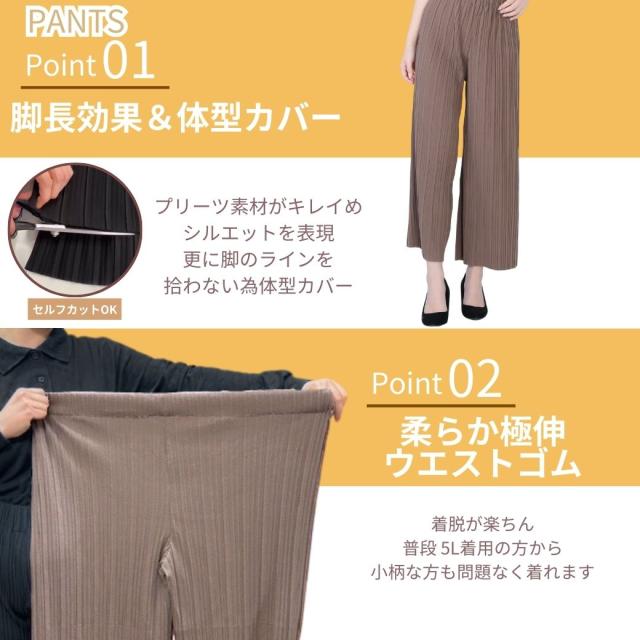 プリーツパンツ イージーパンツ 裾カット 体型カバー 楽々 涼しい ゆったりめ 大きめ 通年用 やみつきパンツ リピ ボトムス レディースパンツ トップス tシャツ 高見え 裾上げ不要 柔らやか