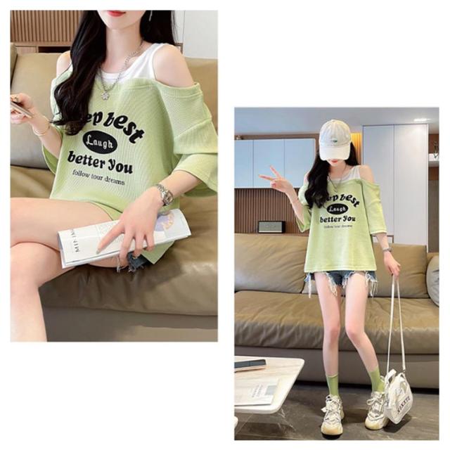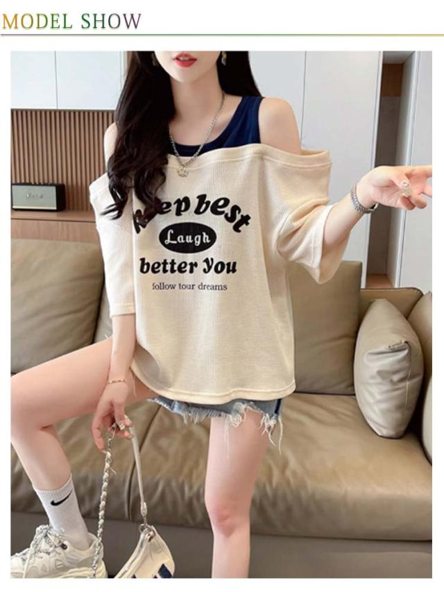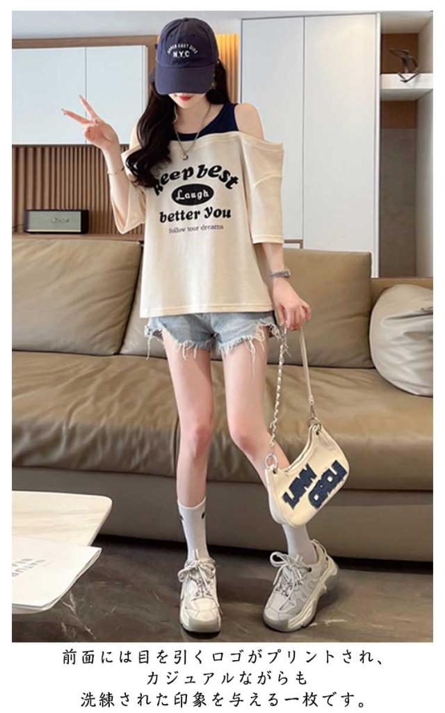 ロゴTシャツ トップス M オフショルダー ロゴ 肩出し 半袖tシャツ カットソー きれいめ 薄手 おしゃれ レディース 半袖tシャツ シンプル 夏 L XL
