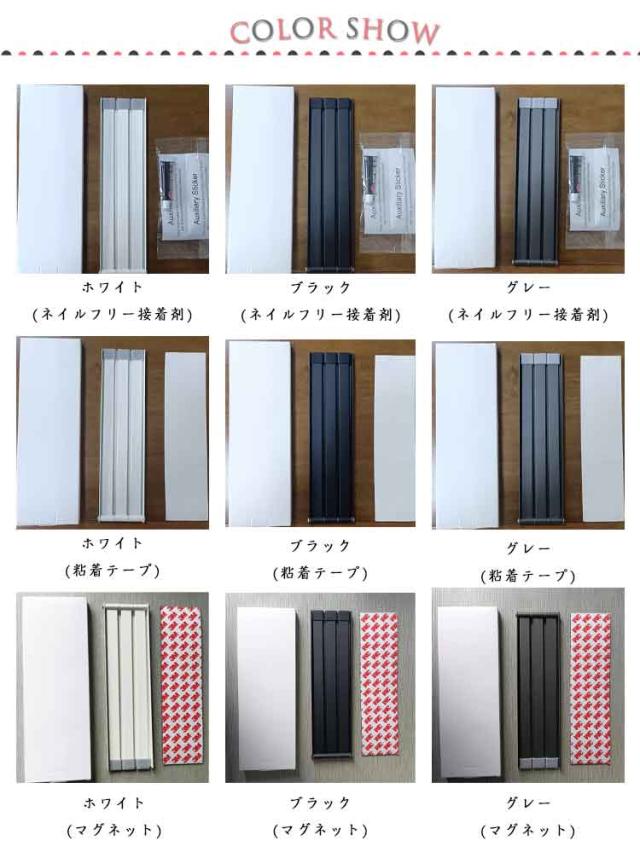 | 色 | ホワイト(ネイルフリー接着剤) ブラック(ネイルフリー接着剤) グレー(ネイルフリー接着剤) ホワイト(粘着テープ) ブラック(粘着テープ) グレー(粘着テープ) ホワイト(マグネット) ブラック(マグネット) グレー(マグネット) |